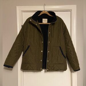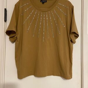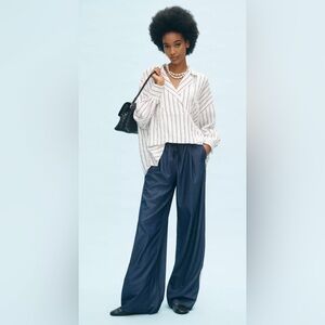 Cotton-feeling material with batting (or a stiffer material; shown in video) lining the sleeves for a pouf effect. Possibly home made.