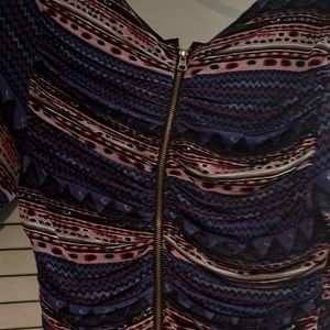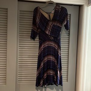 Gorgeous asymmetrical neckline with a patterned print. Roughing in the bodice with a relaxed swing like fall. 3/4 sleeve arms. Fits to about knee.