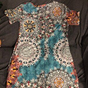 This is a women's short-sleeve casual t-shirt dress with a blue, white, and multi-colored mandala/geometric print. Size Medium.