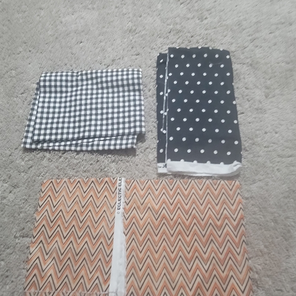 Assorted cotton fabric scrap bundle featuring classic coordinating prints including black and white polka dots, black and white gingham check, and orange chevron pattern.