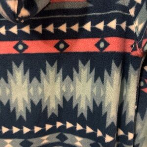 Cozy fleece pullover with a vibrant geometric pattern. Features a mix of teal, orange, and green colors.