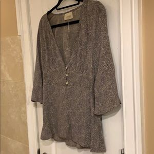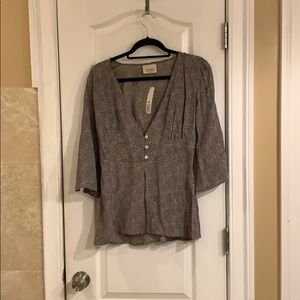 Grey, white, and navy blue print decorates this lightweight, woven top with a plunging V-neck, and three-quarter sleeves with slit cuffs. A set-in waist, with three fresh water pearl buttons, tops the flaring hem with front slit.