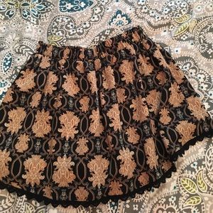 Worn once! Black, White and Gold color patterned flowy shorts with elastic sinched waistband and black lace trim. Loose Fitting. Size small.