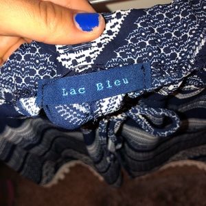 Zig zag white and navy patterned shorts. Fabric is super light weight and the shorts are high waisted. Elastic band at the waist with strings to tie tighter for a comfy fit! Size S (can also fit a smaller size M). Brand is Lac Bleu, sold at American Eagle. In great condition, rarely ever worn. Feel free to make an offer!!