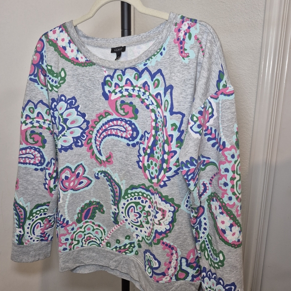 Stylish gray top with vibrant patterns. Perfect for adding a pop of color to your wardrobe.