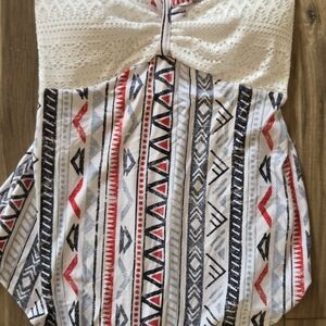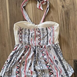 Stylish halter neck top featuring a unique pattern. Perfect for casual outings or a day at the beach. Available in a chic white with black and red accents.