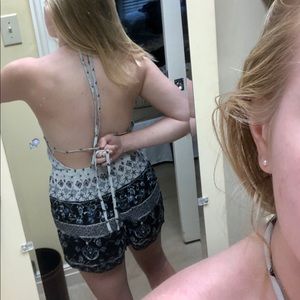 This romper has a flattering tighter top and flowy bottom. It is backless except for one tie mid-back. There is one snag on this back tie.