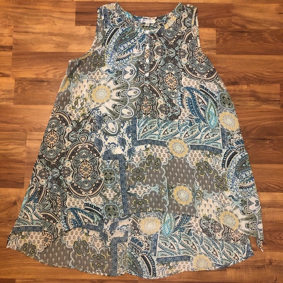 This beautiful patterned sleeveless top is very flowy and has a wonderful high/low detail.