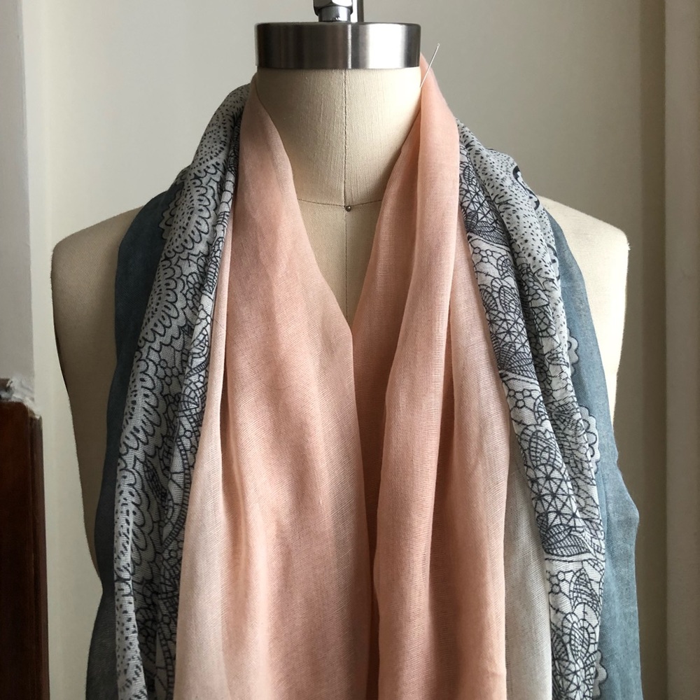 Pink to blue ombré with a white pattern on the edge. Soft, sheer scarf.