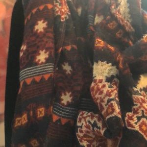 Navy scarf with orange, goldenrod, white, and green patterns.
