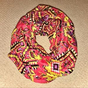 Multi-colored patterned infinity scarf for style and can keep a little warm. Can be worn with a simple top, a nice sweater, or even a dress, very versatile! Only worn once so this is in like new condition without any flaws