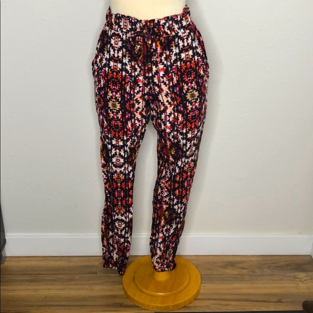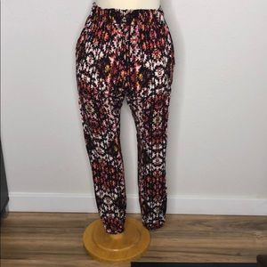 Red, pink and yellow patterned joggers. Front pocket detail. Light weight fabric, great year round!