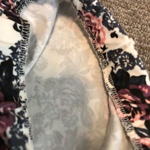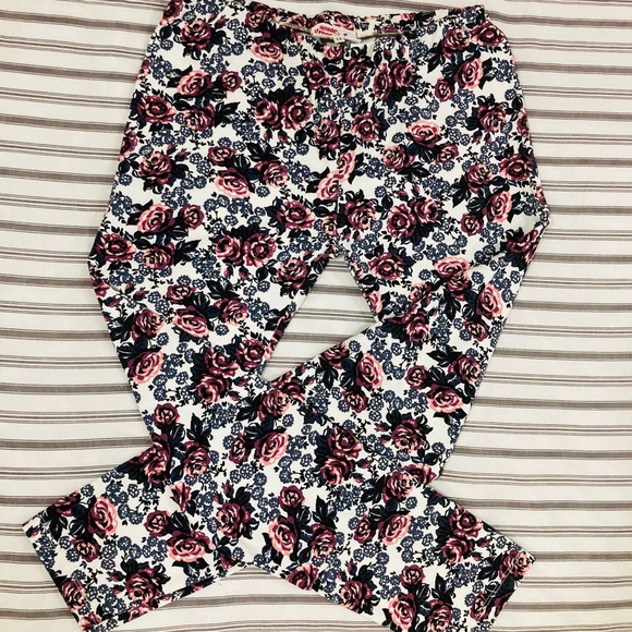 Dusty rose and charcoal vintage floral pattern leggings by British fair labor manufacturer Annie Greenabelle. Unlined, simple fold-over elastic waistband. Overall run small, hitting at ankle length and slim like a medium (they are UK size 14 which is typically equivalent to a US large). Never worn!