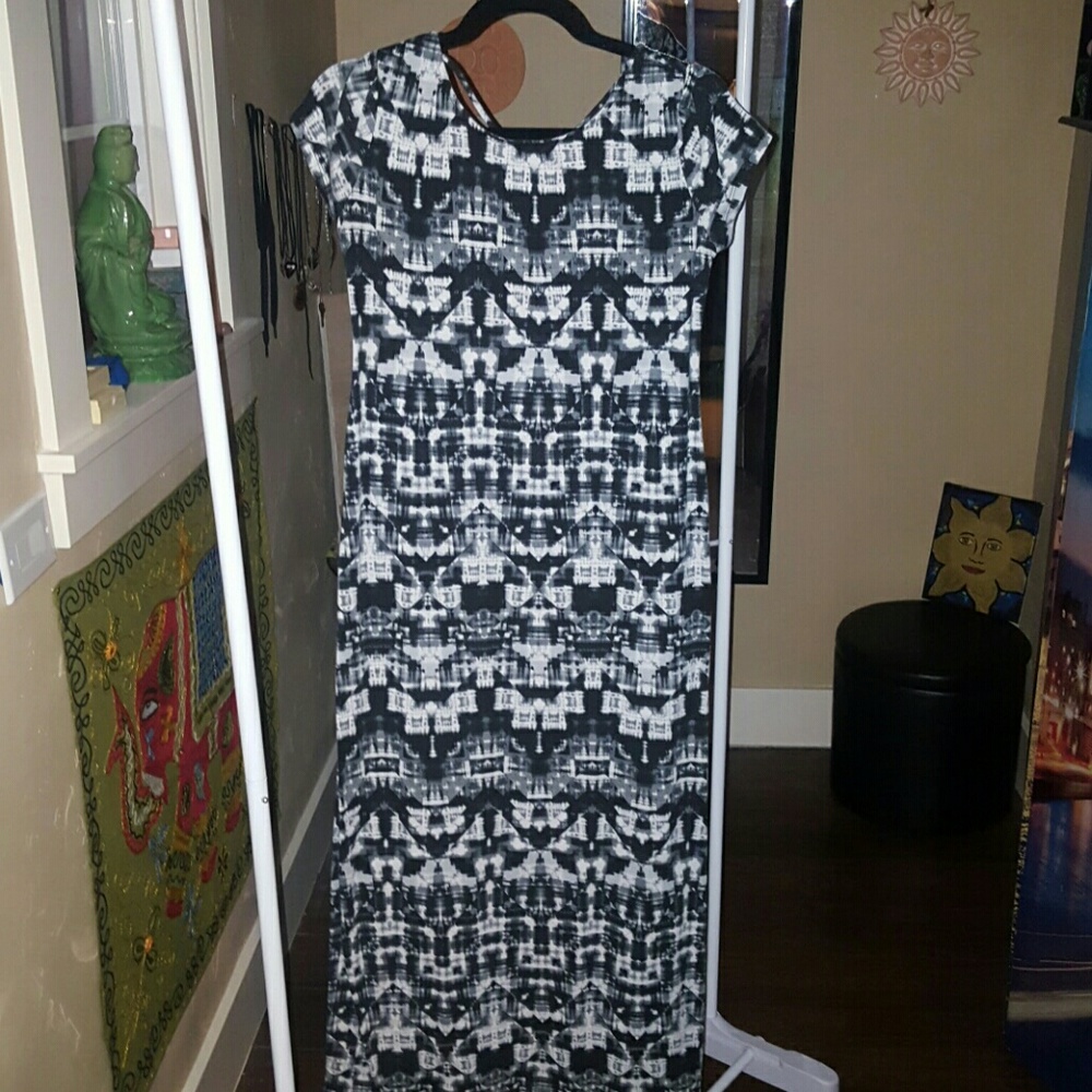 Black, gray, and white patterned ankle-length dress. Cross-strapped in the back, with a thigh-high slit on the left side. Lightly worn.