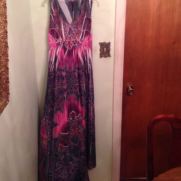 Sleeves patterned Maxi dress. V neck. Size L.