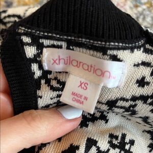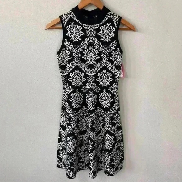 Soft Sweater material mini dress with intricate black and white design. Sleeveless and stylish for any event. Fit and flare and very flattering. Back keyhole cut out. Excellent condition.
