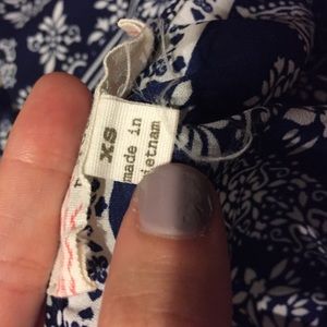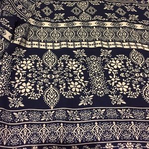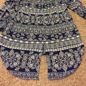 White and navy pattern throughout the whole shirt, slit back, looks great with white pants. fits like a small