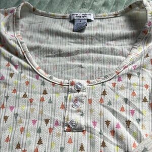 Cozy pajama set with colorful christmas tree pattern. Features a buttoned top and matching pants.
