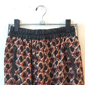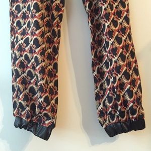 Patterned high-waisted pants with ankle cuffs. Two zip front pockets . Elastic waistband. Super comfy. Unlined. Navy, red, cream pattern. Cuffs and waistband are polyurethane. Only worn once for event. Tags still attached.