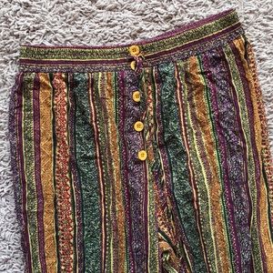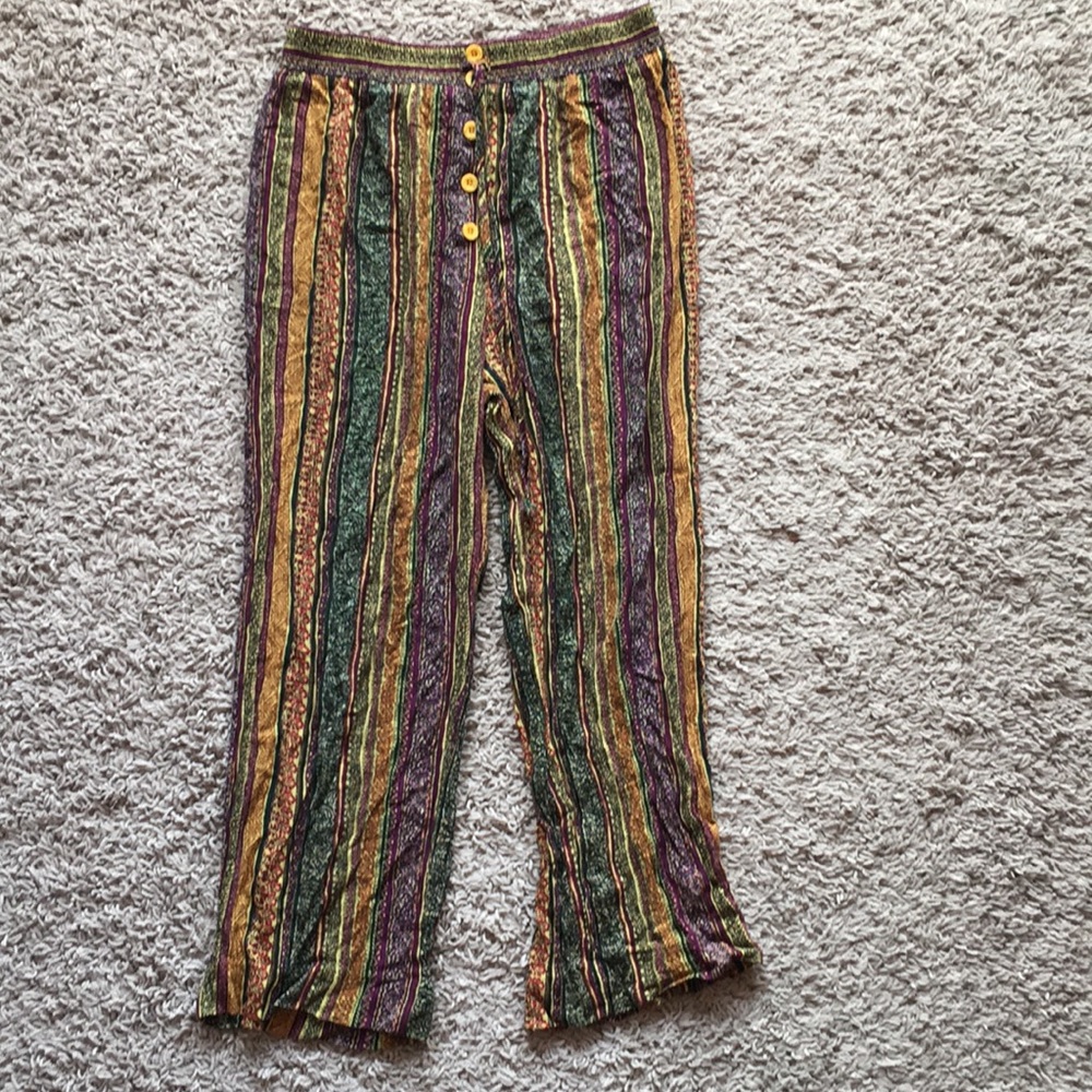Great condition patterned loose pants. Drawstring with decorative buttons. Super comfortable! I’m 5’6 and these hit right at the ankle, would be perfect for someone a little shorter unless you’re looking for a Capri fit. !!!!Size says 8 but these fit a Small-Medium!!!
