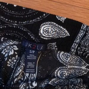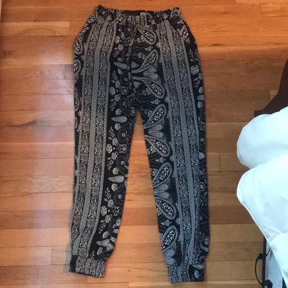 Perfect condition. Elastic/stretchy waist and elastic at the ankles. Pockets on the back. Tie in the front. Light material. So comfortable! Perfect for a spring or summer night or day out!
