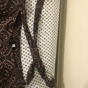 Patterned pants with a tie waist. Very comfortable and they cinch at the ankles as well. The band in the waist sometimes gets twisted while wearing, but is easily fixed. Runs a bit large.