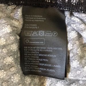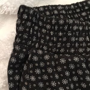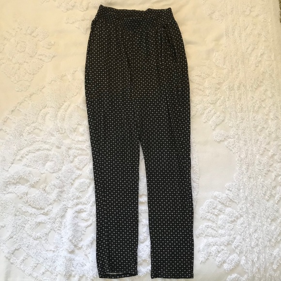 Black & white pants from H&M with pockets and elastic waistband. Loose around the thighs, tighter around the ankles. Super soft — feel like pajama pants but still look professional!