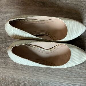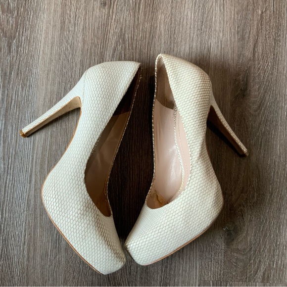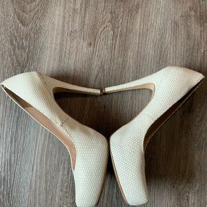 Cream with a tan background, platform Pumps. The pattern hides defects well. A little worn but no rips, tears, stains or issues.