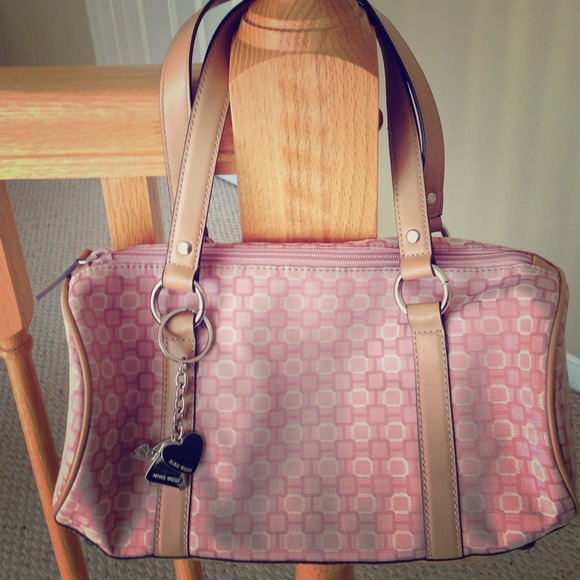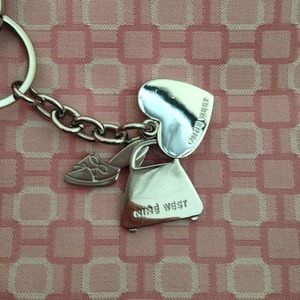 Circular shaped purse. Never used. Tan Leather details and comes with silver keychain (heart, heels, and purse).