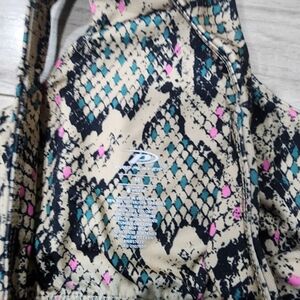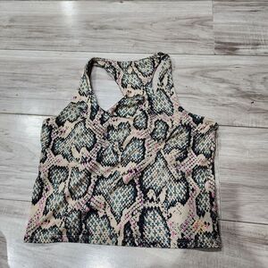 Stylish racerback sports bra with a unique snake print design. Features a mix of tan, black, and pink colors.