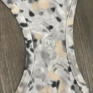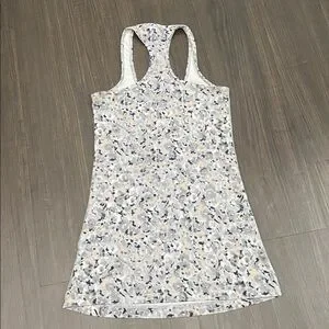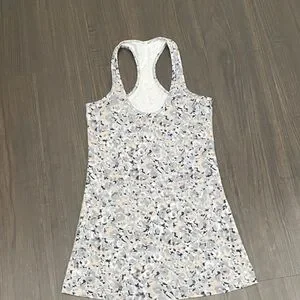 Stylish racerback tank top with a unique pattern. Features a blend of gray, white, and cream colors.