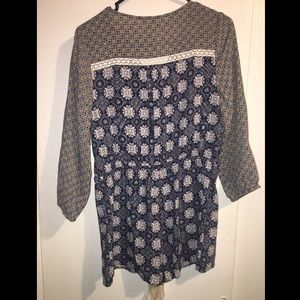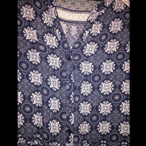 Patterned romper with the top half as a button up. String with fringes on the end to tighten the bottom half.