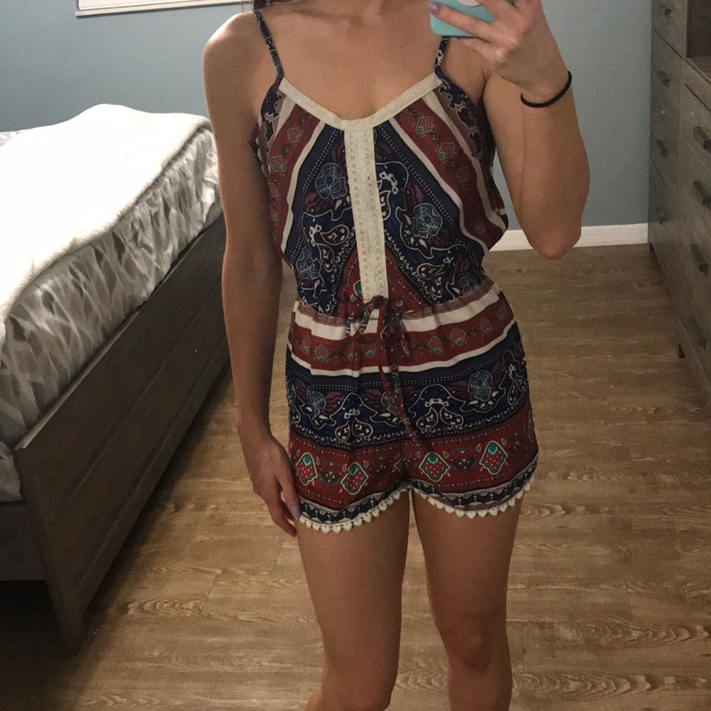 Patterned Romper Adjustable waist and straps Thin material but looks nice on I am 5’4”, 110 pounds, and I usually wear a size 0