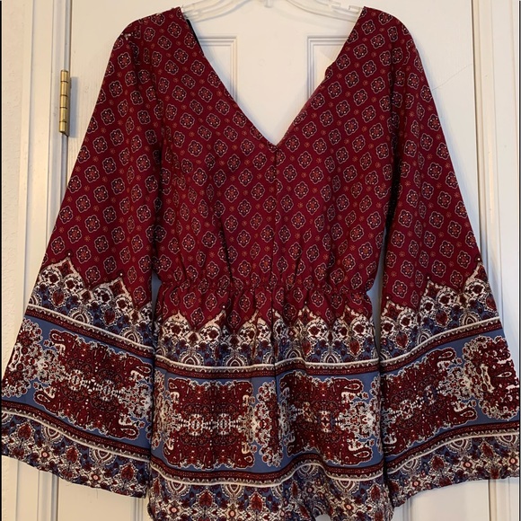 A maroon blue and white colored romper, sold by Forever 21, ties in back, with v-neck pattern and is long sleeved