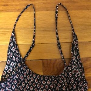 Red and black romper with button down in half or front with a tie. Straps are adjustable.