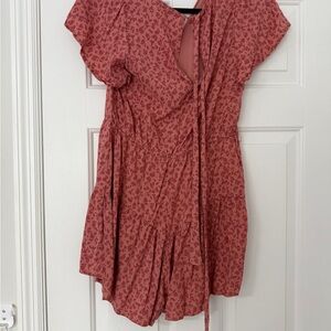 Never worn. Stylish rust red romper with a subtle pattern. Features a wrap design and short sleeves. It has a belt shown on the second picture it’s hanging from the hanger