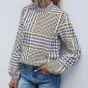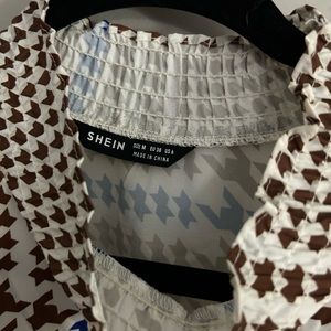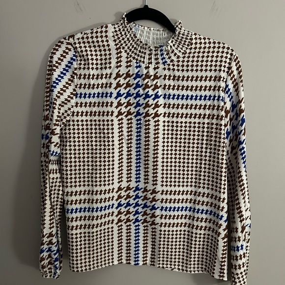 Patterned shirt with ruffled/scrunched collar.