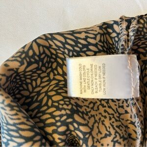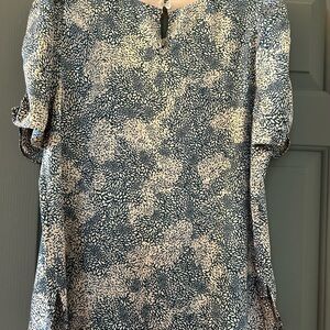 Chic top with a striking pattern. Features tan and dark blue colors. Tan ribbing detail on neckline and rushed short sleeves. Silky material, airy yet tailored fit. Perfect for business or travel.