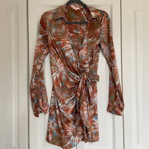 Gorgeous patterned satin dress with a wrap around tie, extremely flattering. Worn once.