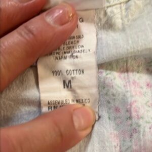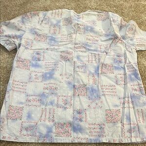 Colorful patterned scrub top with a mix of pastel shades. Features a comfortable fit and multiple pockets.