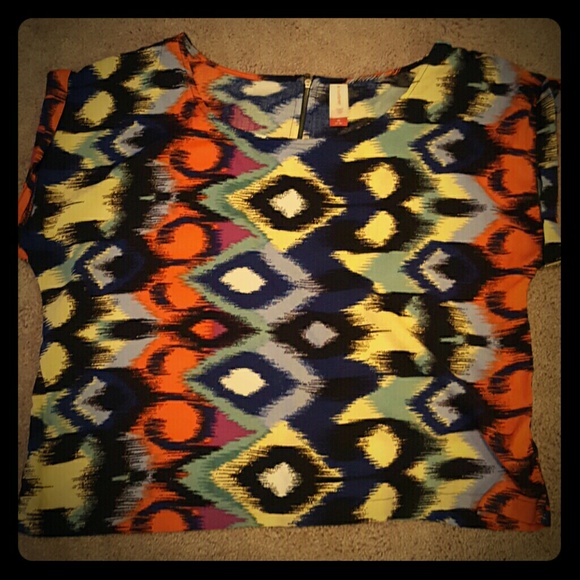 Aztec patterned short sleeve shirt. Shorter, swing style. Cuffed sleeves and zipper in back are great detailing. Perfect for summer!