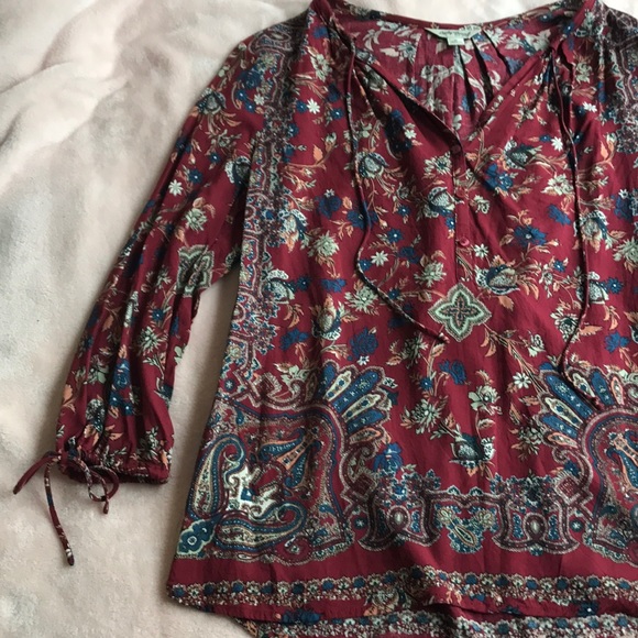 Lucky Brand patterned shirt; Size S; Buttoned front with adjustable ties on the front and sleeves; Lightweight; Only worn once, like new condition