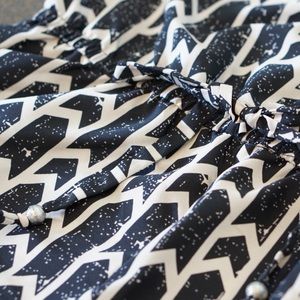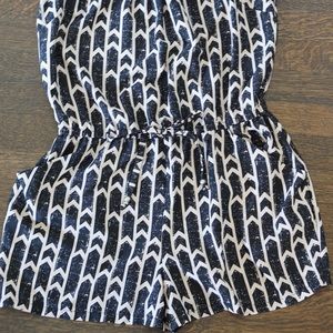 Sleeveless romper with a tie waist. Loose and comfortable fabric. It has POCKETS! Zipper closer. Interesting pattern (swipe to see close up)