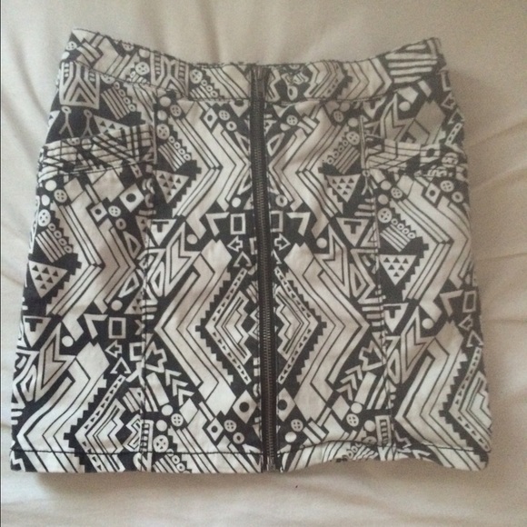 Black and white geometric patterned skirt with zipper up the front and pockets. Fits tightly and isn't too short