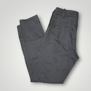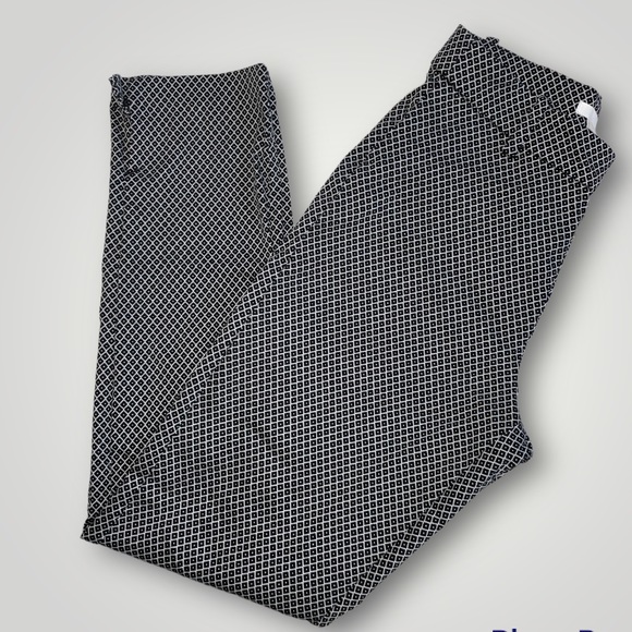 Patterned slack • moderate stretch • ankle length w/ slit • 64% cotton, 32% polyester, 4% elastane • faux back pocket detail