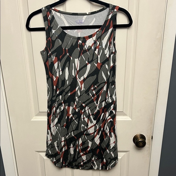 This stylish sleeveless top features a unique pattern in shades of black, gray, and red. Perfect for any occasion, it offers a comfortable fit and a modern look.