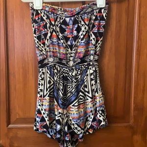 100% rayon strapless patterned romper. Has pockets on the sides. Good condition . Really sad about getting ride of this one it was one of my favorites. It's really really cute Highly recommend.