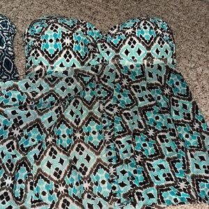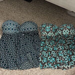 Set of two strapless tops with geometric patterns. Features shades of blue, black, and white.