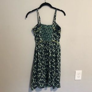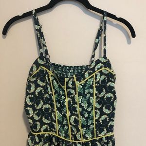 Navy sundress with yellow/white/green pattern by LC Lauren Conrad. Size 2. Adjustable straps. Top looks somewhat corseted and cinches at the waist. Light smocking at the back so there’s slight give in the sizing. In excellent condition! Offers welcome.