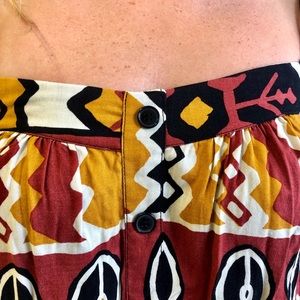 orange, red, white & black pattern on a sundress, buttons down the front